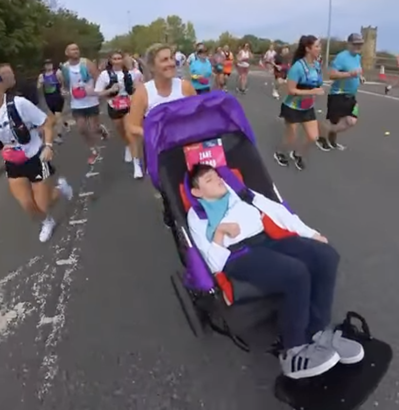 Particular thanks are due to the amazing team of Angie Simpson with friends and family that pushed Zane along the 13.1 mile run in the amazing time of 2 hrs 27 min.